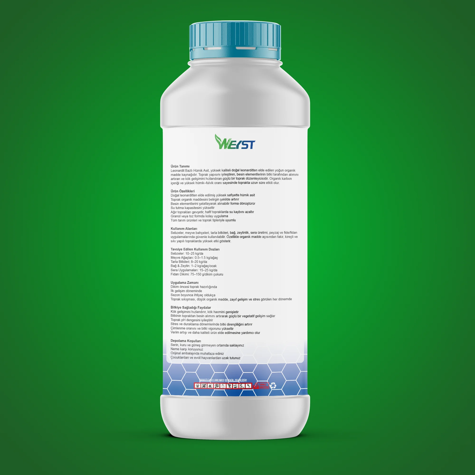 Weyst Hümik Asit, üstün kaliteli Leonardit mineralinden ekstrakte edilmiştir. Yüksek oranda Hümik Asit ve değişken oranlarda Fulvik Asit içerir. Genellikle toz, kristal veya sıvı konsantre formlarda sunulur. Yüksek saflığı, düşük dozlarda bile güçlü etki sağlar.